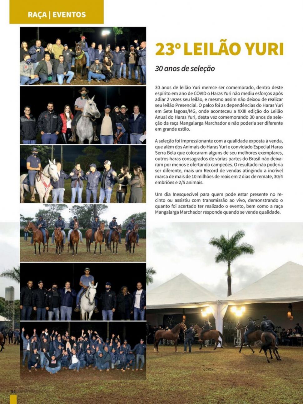 30 anos de leilão Yuri merece ser comemorado, dentro deste espírito em ano de COVID o Haras Yuri não mediu esforços após adiar 2 vezes seu leilão, e mesmo assim não deixou de realizar seu leilão Presencial. O palco foi as dependências do Haras Yuri em Sete lagoas/MG, onde aconteceu a XXIII edição do Leilão Anual do Haras Yuri, desta vez comemorando 30 anos de seleção da raça Mangalarga Marchador e não poderia ser diferente
