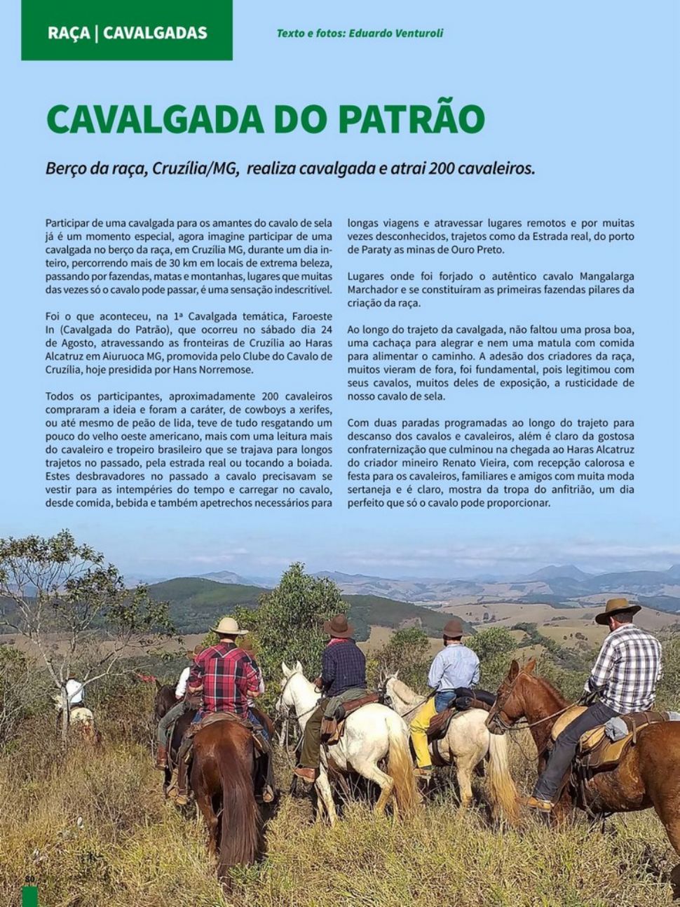 Participar de uma cavalgada para os amantes do cavalo de sela já é um momento especial, agora imagine participar de uma cavalgada no berço da raça, em Cruzília MG, durante um dia inteiro, percorrendo mais de 30 km em locais de extrema beleza, passando por fazendas, matas e montanhas, lugares que muitas das vezes só o cavalo pode passar, é uma sensação indescritível.