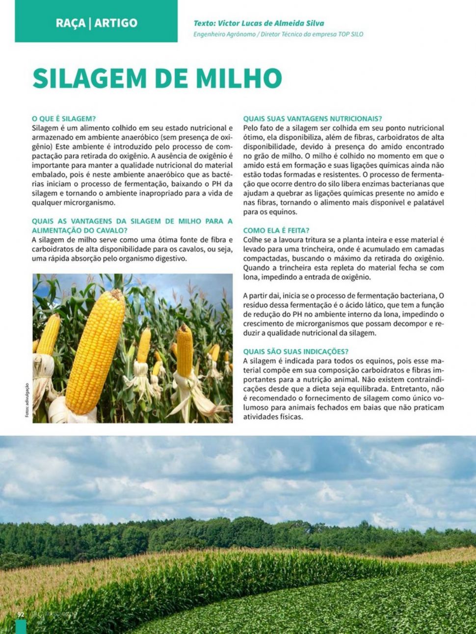 Pelo fato de a silagem ser colhida em seu ponto nutricional ótimo, ela disponibiliza, além de fibras, carboidratos de alta disponibilidade, devido à presença do amido encontrado no grão de milho. O milho é colhido no momento em que o amido está em formação e suas ligações químicas ainda não estão todas formadas e resistentes. O processo de fermenta- ção que ocorre dentro do silo libera enzimas bacterianas que ajudam a quebrar as ligações químicas presente no amido e nas fibras, tornando o alimento mais disponível e palatável para os equinos.